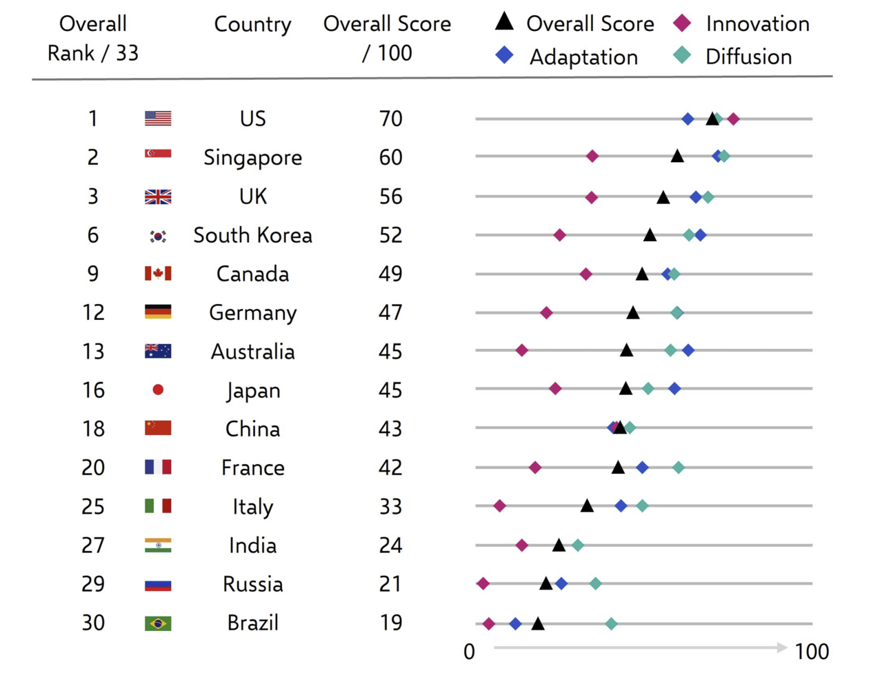 The US, Singapore, and the UK are at the forefront of AI adoption.